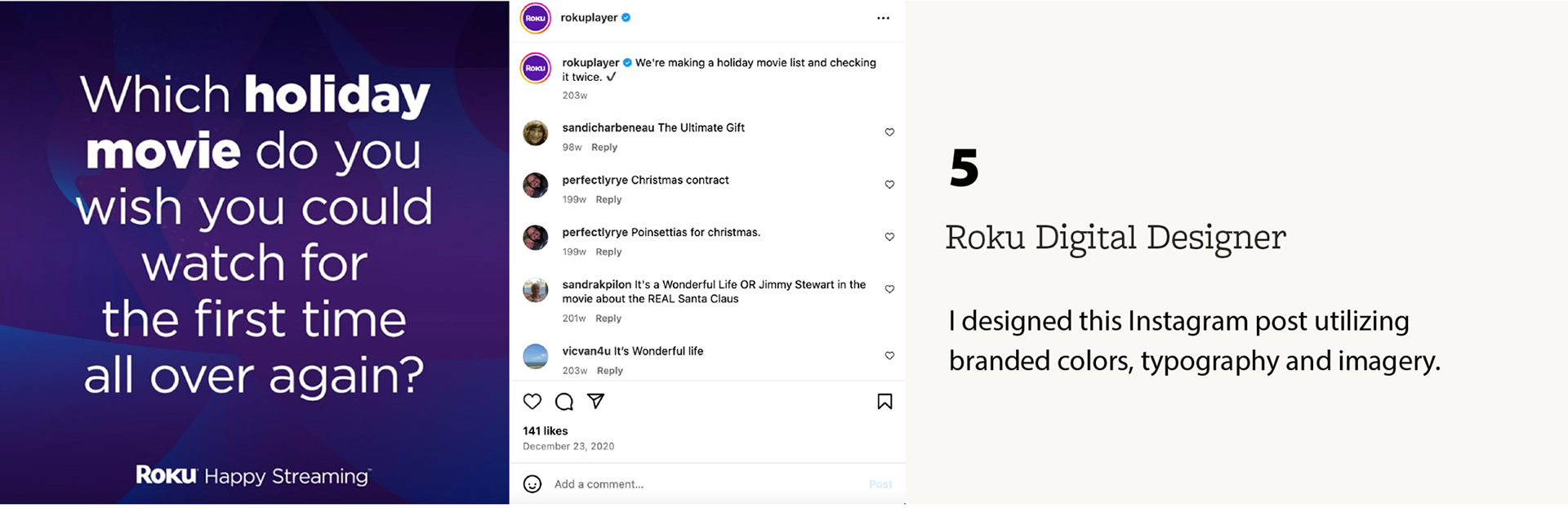 Freelance Seasonal Social Media Designer for Roku’s On-Device and TV teams, creating festive visuals and campaign assets to engage audiences during holiday marketing initiatives.